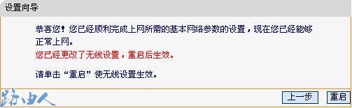 (5)设置完成后,单击下一步,如果您更改了无线设置,将弹出如下图所示的设置向导完成界面,单击重启使无线设置生效。