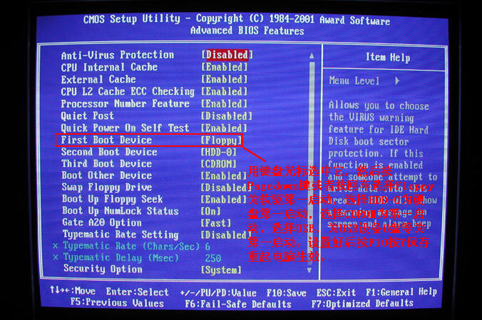 第一项BIOS基本常用设置就讲到这里了 Advanced BIOS Features(高级BIOS功能设置) 第二项。 下面讲一下第二项最常用的设置。 1.关闭BIOS防毒保护。 Anti-Virus Protection 请看图片5