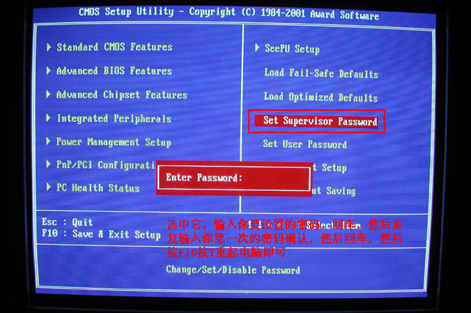 Set Supervisor Password(设置超级用户密码) 用户进入BIOS密码那一项就不说了,这一项设置了,开机后就需要密码,否则根本就无法进入系统。详细请看图片12