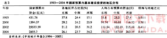 自改革开放以来,国家投资布局的重点逐步由内地向沿海地区转移。1978—1997年,东部沿海地区国有单位基建投资占全国的比重由40.1%迅速提高到53.3%,而中部地区由30.6%下降到23.6%,西部地区则由20.4%下降到15.7%。从国家预算内投资的地区分布看,在1993—1997 年,由于部分地区投资所占比重在不断下降,东部地区国家预算内基建投资所占比重提高了5.9%,而中西部地区则提高了10%。之后,由于部分地区投资比重的增加,三大地带所占比重又出现一定程度的下降。若以内地投资为1,沿海与内地国家预算内基建投资之比,从1993年的0.91下降到2000年的 0.58后,又继续下降到2004年的0.45(见下页表2)。从投资总量看,西部地区占有的国家预算内基建投资的比重到2002年时才首次超过东部地区,其人均占有的国家预算内资金在2000年时首次超过东部地区。说明国家预算内基建投资在21世纪初逐渐偏向西部地区。