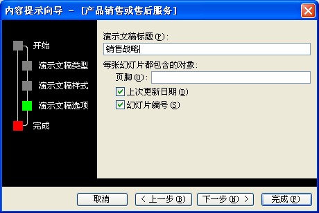 ⑤ 输入演示文稿的标题为“销售战略”,单击【下一步】按钮,打开的对话框。