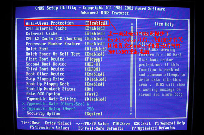 第一项BIOS基本常用设置就讲到这里了 Advanced BIOS Features(高级BIOS功能设置) 第二项。 下面讲一下第二项最常用的设置。 1.关闭BIOS防毒保护。 Anti-Virus Protection 请看图片5