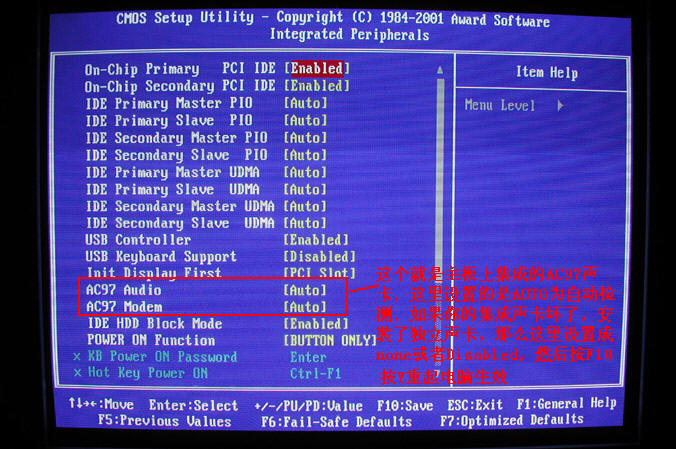 第二项常用BIOS就讲到这里。 下面讲 Integrated Peripherals(综合外部设备设置) 1.怎么样屏蔽集成声卡。 请看图片9