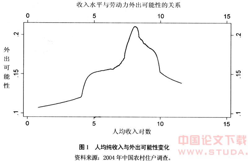 还有学者研究了家庭因素对劳动力外出的影响。杜鹰等(1997)认为,西方的人口迁移决策是个人寻求利益最大化及成本最小化的个体决策过程,而受传统文化理念的影响,中国农村劳动力流动决策则与家庭利益最大化联系在一起,而以获取最大化的经济收入为最直接目的。蔡防等(2003)利用国际上相对经济地位变化假说,分析了家庭相对收入变化对农民外出打工决策的影响,并且用调查资料验证,在居住地感受到相对经济地位下降程度越强,迁移到外地就业的动机越强。因此,农民迁移具有双重动因,即绝对收入差距与相对剥夺。姚洋在研究家庭拥有耕地与农民外出的关系后,排除了耕地越少越容易流动的共性,而提出了倒“U”字假说,即耕地较少和较多的农民外出打工的意愿较低,而耕地拥有量居中的农民外出打工意愿较强(姚洋,2002)。但王志刚等(2003)利用湖南省实地调查材料,经过实证研究得出的结论是,耕地拥有量与农民外出打工之间没有倒“U”关系,而教育对农民外出打工则具有促进作用。