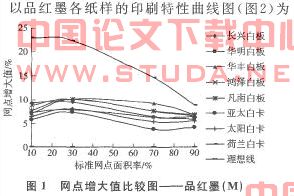 2.1网点增大值对比分析以品红墨各纸样的网点增大比较图(图1所示)