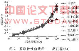 2.2印刷特性曲线对比分析以品红墨各纸样的印刷特性曲线图(图2)
